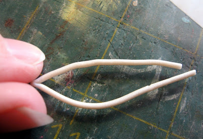 Ensuite, l'état de votre argile perle et soit rouler dans une longue chaîne ou l'extruder à travers un trou relativement petit dans l'extrudeuse. Prenez un morceau de 4 ou 5 pouces de long et pliez-le en deux. Type de squish la fois entre les doigts un peu. Ce sera le sommet du cœur: