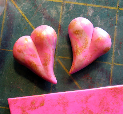 Maintenant l'état de votre or et d'argile sorte de pétrir entre vos mains un peu à disalign le mica dans l'argile. Roulez sur vraiment mince et découpez 2 coeurs. Je n'ai pas eu un cutter cœur la taille que je voulais alors j'ai utilisé un coupe-feuille et parés l'extrémité la plus large de sorte qu'il ressemble au sommet d'un coeur: