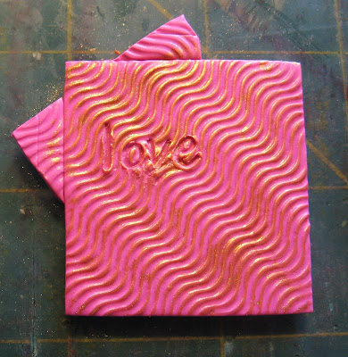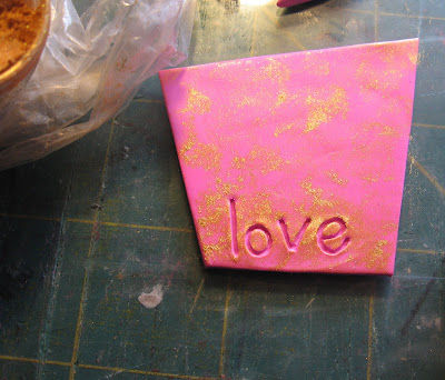 Ensuite, sortez votre poudre d'or métallique (j'utilise PearlEx-je pense que c'est l'or antique.) Et tout doucement toucher la surface de la poudre avec votre index. Vous voulez juste une couche de micro-mince de la poudre sur votre doigt. Touchez l'argile rose avec votre plaqué or doigt à quelques reprises. Continuez de toucher la poudre puis l'argile jusqu'à ce que vous avez une sorte de conception d'or tachée sur votre argile rose. J'ai fait les empreintes digitales d'or un peu plus épais autour des lettres pour les faire ressortir davantage. Pour ce faire, le coeur rose aussi. (J'ai ajouté un peu d'argile où les coins du carré d'or se pendre à les soutenir lors de la cuisson et de leur donner plus de force.)
